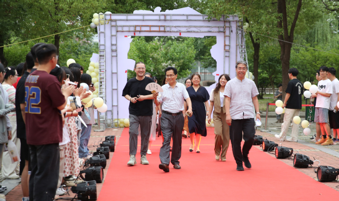 在鲜花、气球与灯光的簇拥中,蚌埠学院艺术设计学院党委书记高善春老师、院长胡飞老师、党委副书记李俊锦老师、副院长王磊老师、各专业老师、毕业班全体辅导员在学生们的欢呼声中,走过“毕业门”,踏上红地毯。