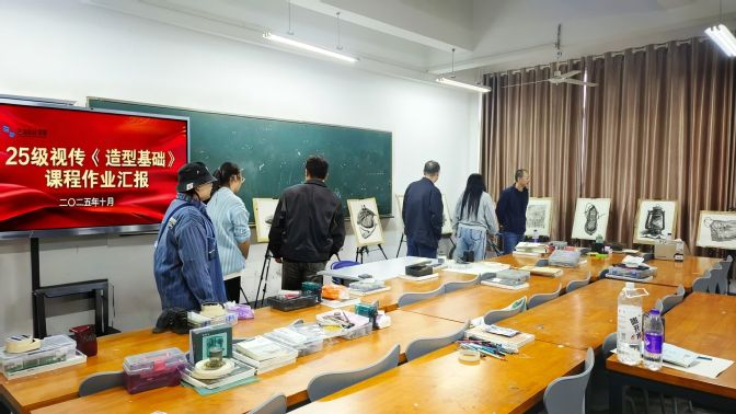 2025年10月15日,25级视觉传达设计专业在艺术楼5楼画室举行《造型基础》课程作业汇报活动。此次活动以“历史革命文物”为主题,集中展出60余件师生作品,将专业技能训练与思政教育深度融合,旨在赓续历史文脉,传承红色基因。
