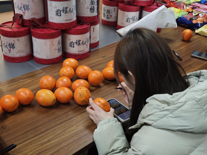 活动现场温馨且充满暖意,学院精心准备了考研文具礼盒、各类零食,更有别出心裁的“祝福橙”—同学们亲手在橙子上书写“心想事橙”“马到橙功”等吉祥话,以创意形式传递美好期许。