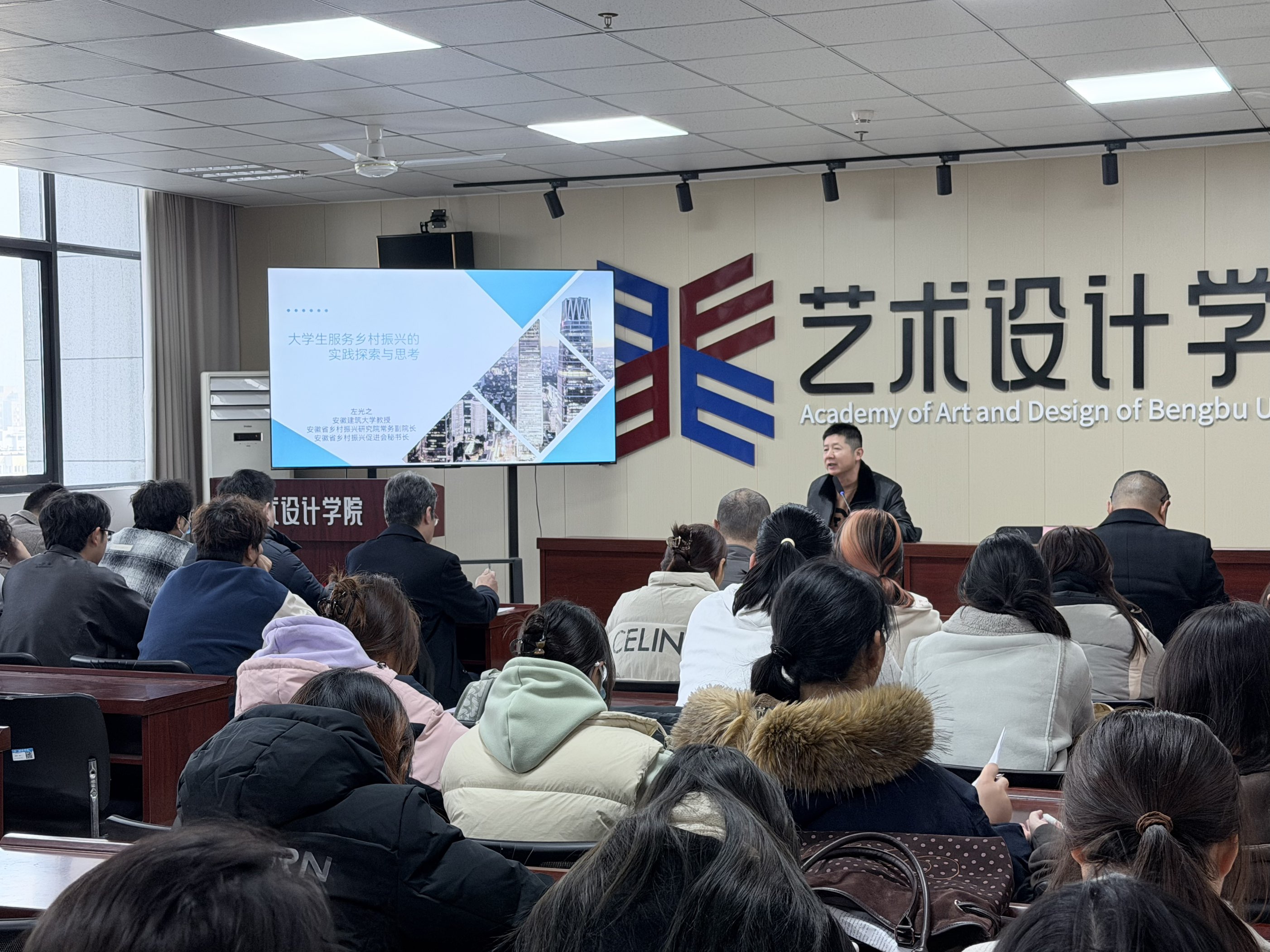 12月11日上午10点-12点,安徽建筑大学左光之教授在F楼713学术报告厅以“大学生服务乡村振兴的实践探索与思考”为主题开展专题讲座,院长胡飞主持讲座,近百位艺术设计学院师生参与了此次讲座活动。